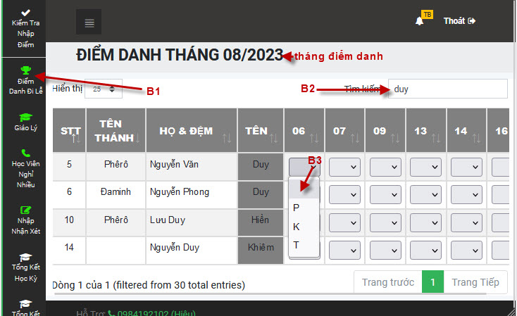B2: Tìm học viên cần điểm danh (chỉ điểm danh học viên nghỉ).