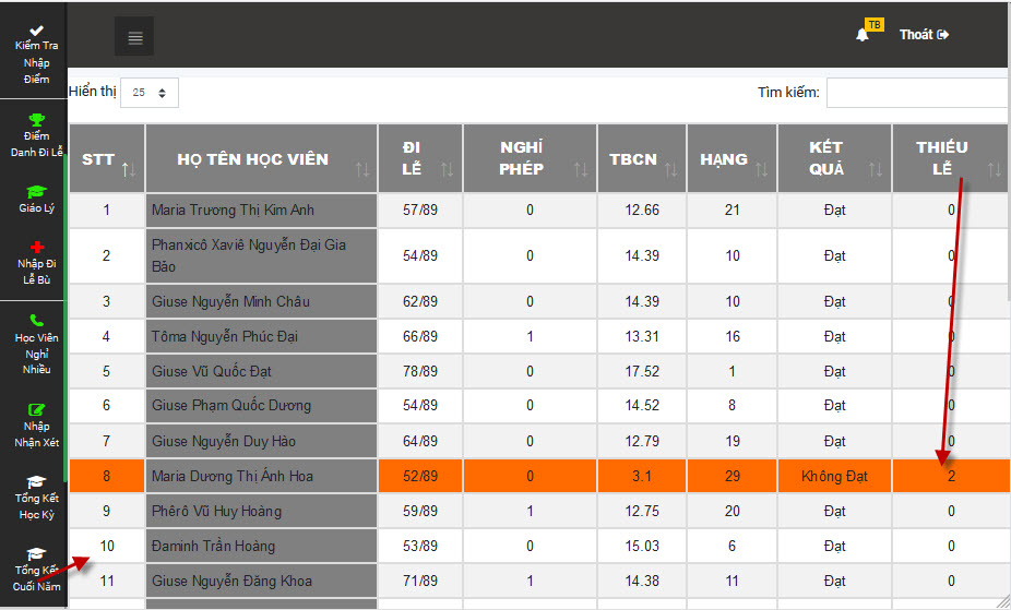 - Chức năng này giúp bạn xem nhanh kết quả cuối năm, thiếu bao nhiêu lễ hoặc tổng kết không đạt.